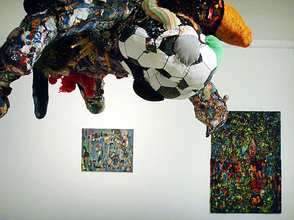 Von der Decke hängt bäuchlings ein Wesen, das wie ein Fallschirmspringer Arme und Beine von sich streckt. Man könnte auch an eine fallende Katze denken. Den Kopf dieser Kreatur zwischen Mensch und Tier bildet ein zerbeulter Fussball aus Stoff , eine Clownsnase aus einem Samtballen und ein Hut aus einer Stoffeistüte sind daran angenäht. Dieser Kobold mit seinem freundlichen Lächeln streckt die vier Extremitäten wie Gewächse oder Wucherungen, von sich. Sie enden teilweise in schnabelartige oder verdickte Auswüchse. Ein verhältnismässig grosser Penis – oder ist es ein Tierschwanz?- ragt zwischen den ausgebreiteten Beinen, geformt aus einem ausgestopften Stück blauer Feinstrumpfhose. Er sieht wie ein drittes Bein aus, wirkt jedoch viel weicher und schwächer als Arme und Beine.