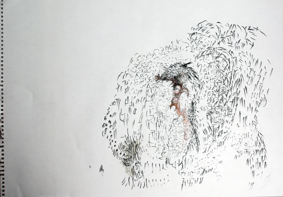 Mann geht von Bühne durch Tor aus Tieren Grafit auf Papier